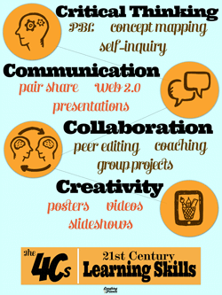 Bright and colorful poster for your classroom that reminds both teacher and students the four learning competencies highlighted by the new Common Core Standards for developing students with 21st Century Skills. Includes a few suggestions for activities and projects for meeting these instructional goals.